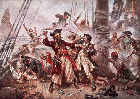 Das Gemälde Die Gefangennahme des Piraten Blackbeard 1718 von J. L. Ferris zeigt den berüchtigten Piraten Edward Teach, genannt Blackbeard, in seinem letzten Gefecht mit den Briten. Blackbeard überfiel immer wieder die Küsten Nordamerikas und der Westindischen Inseln und teilte seine Beute manchmal sogar mit dem Gouverneur von North Carolina. Schließlich stellten ihn Schiffe aus Virginia in einer Bucht vor North Carolina. Blackbeard starb im Kampf mit dem britischen Kommandeur; sein abgeschlagenes Haupt wurde am Bugspriet seines Schiffes zur Schau gestellt.
